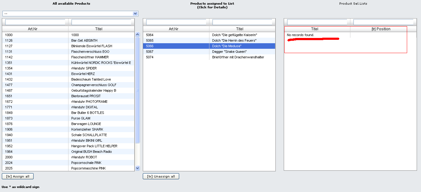 create one or several selection lists and assign all products from Fantasy category (standard PE demodata). somehow for this case in "Product Sel.Lists" list there are shown none of assigned selection lists for product No.5066 (in shop frontend assigned selection lists are displayed). image attached