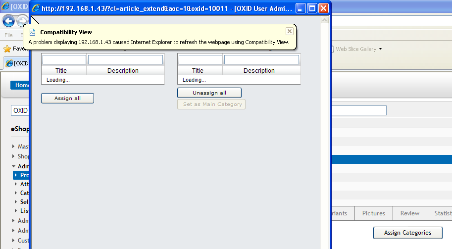 | Description | Internet Explorer 8 gives a message, which says that a display problem occured and switches to compability view while opening a AJAX list. It's reproducable in OXID Demo Shop: http://demoshop.oxid-esales.com/professional-edition/admin/ | ||||