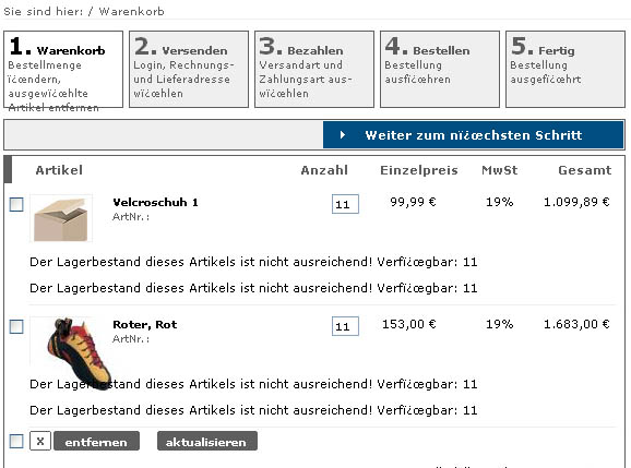 | Description | If you're at the basket (step 1) and want to rise the number of an item that is higher than the stock of the article, the error message will be displayed below every article in the basket. If you're doing this for several articles, below every article every error message will be displayed. | ||||