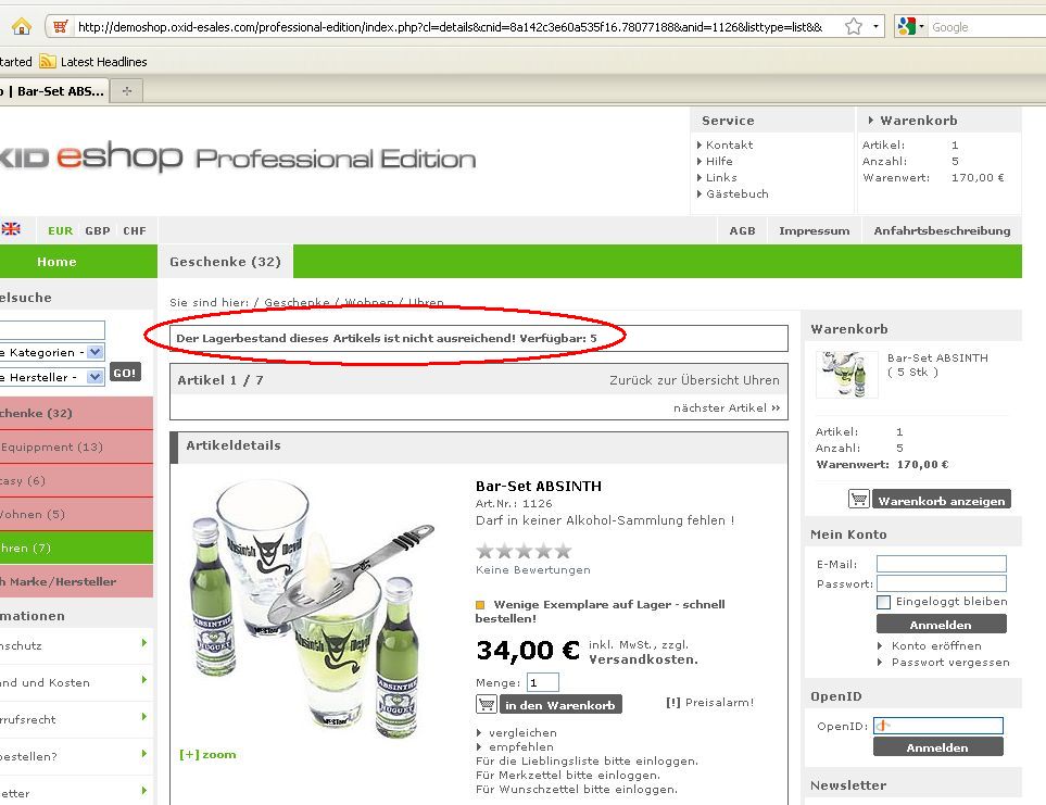 Hi, I tested it again and it didn't change anything. Tested it in EE- and PE-Demoshop in Mozilla and IE. When increasing the amount in basket all works fine. But when I try to put a higher amount into basket when I am on the product-detail-page there is no message. My Workflow in PE: - Login to the backend - Edit the Article "Bar-Set ABSINTH" - Set oxstockflag = 2 (Wenn ausverkauft offline / If out of Stock, offline) - Set amount on stock = 5 - Go into frontend on product-detail-page and put 10 into basket --> There are 5 Bar-Sets in basket but no message, that there are no more available Workflow in EE is the same, just need to update Views at the start |