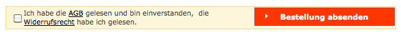 | Description | In step 4 of the checkout the user needs to confirm that he has read the AGB (terms & conditions). The standard translation in german says: "Ich habe die AGB gelesen und bin einverstanden, die Widerrufsrecht habe ich gelesen. " This is not correct german. A correct sentence would be "Ich habe die AGB gelesen und bin einverstanden, die Informationen zum Widerrufsrecht habe ich gelesen." or "Ich habe die AGB gelesen und bin einverstanden, die Belehrung zum Widerrufsrecht habe ich gelesen." | ||||