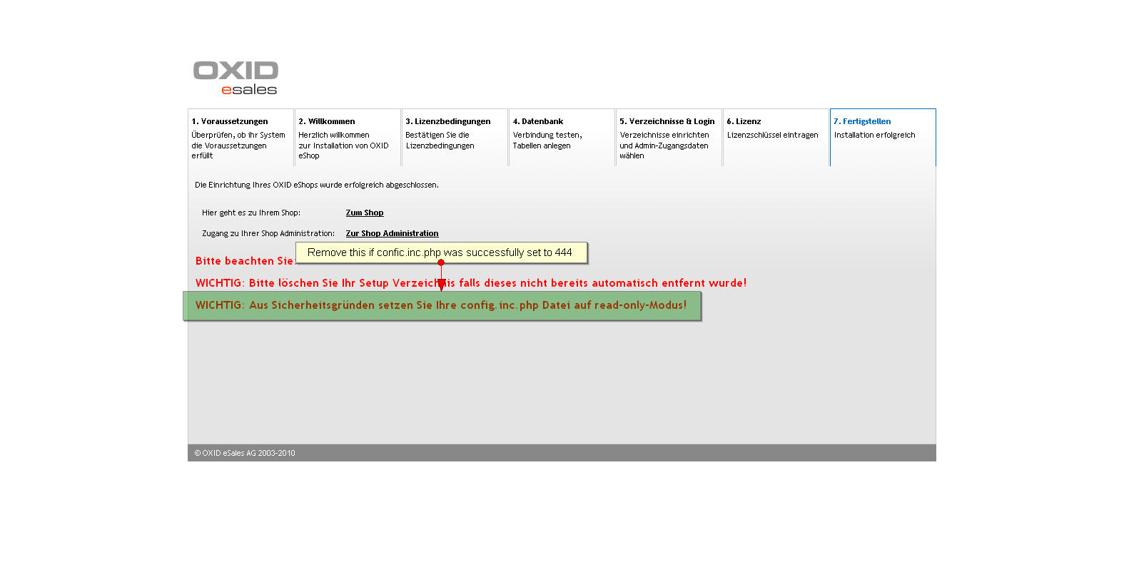 Try to set config.inc.php to 444 during setup. See also setup-laststep.gif |