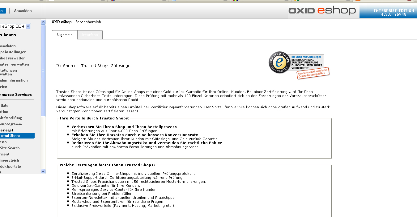 | Description | Hai, installing the EE, step2: Please choose your country: Germany, Austria, Switzerland [no] Check for available updates regularly After that, fo further the regular data. Login to the backend (DEU), Seal of Quality => Trusted Shops There are two tabs (the old ones) and not just one. A click to "Interface" will kick you out of the admin ;) Rgds Olli | ||||