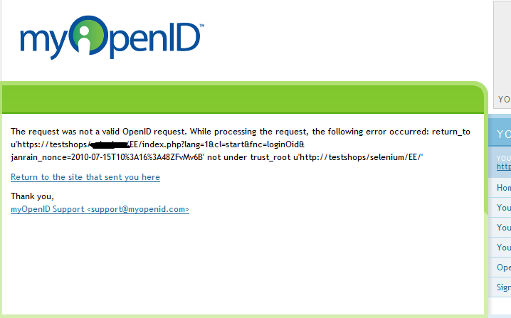 | Description | I installed a local testshop and entered the SSLShopURL in the config.inc.php. After entering my openid in the openid login form i am getting following error: OpenID Authentifizierung fehlgeschlagen: return_to u'https://127.0.0.1/OXID_ESHOP_CE_4.4.0_28699/index.php?cur=1&cl=start&fnc=loginOid&janrain_nonce=2010-07-05T09%3A29%3A48Za9eGRp&openid1_claimed_id=http%3A%2F%2Fre-shopmodule.myopenid.com%2F' not under trust_root u'http://127.0.0.1/OXID_ESHOP_CE_4.4.0_28699/' If the SSLShopURL is set to null, the login works. The same behavior is reproducible in the shop of one of our customers. | ||||