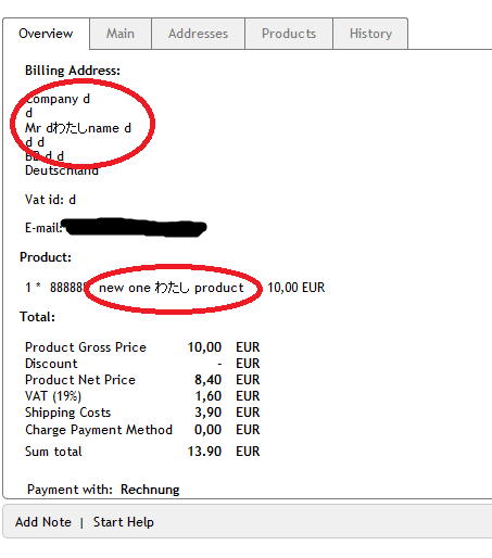 Reminder sent to: Tokyoj Hi, I think the issue occurs because you have installed OXID eShop not as UTF8. During installation there is a special option in the 4th setup step "Use UTF-8 character encoding". Please choose this one during setup and the doublebyt characters will be displayed correctly in the eShop. Please see attached screenshots with some copy-paste Japanese text in the Product name and First Name of user - these are displayed correctly. So the entry is closed. If you still experience some problems because that issue in UTF8 shop - please Reopen this entry with the details. Thank you. |