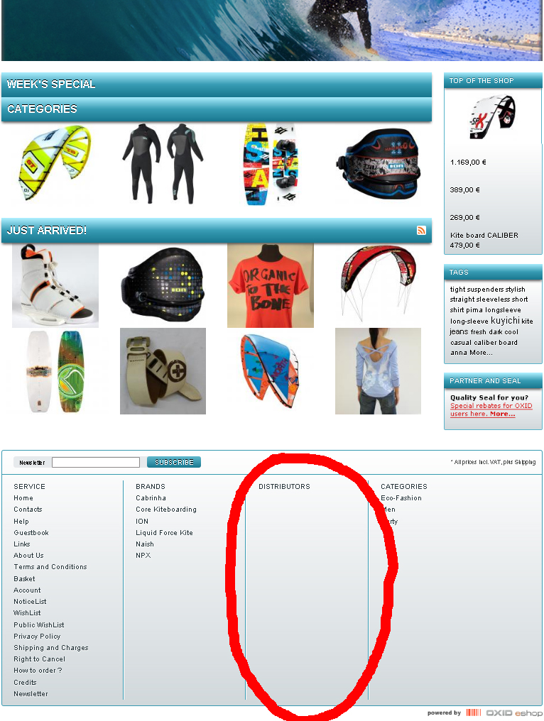 | Description | The column "distributors" in the footer has to be removed. Functionality in the shop remains, but displaying in the footer is not needed. | ||||