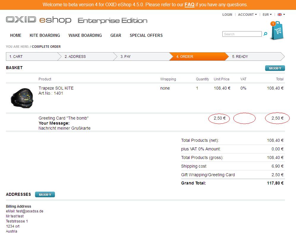 | Description | "Show wrapping-vat in basket" has to be switched on. It behaves a bit strange: In a normal vat-including order the greeting-card-vat is correct (including 19% vat), and the vat-percentage is correctly displayed in the vat-coumn ("19%") and net and gross are also correct below the table in the sum-rows. But when you switch your country and ustid so the order becomes vat-free, all prices are shown in net except shipping costs and wrapping costs. See screenshot attached. Solution: need to implement the option, which tells that price inserted for Wrapping or Greeting Card is Netto or Brutto. There are such options for Shipping Costs. Having this option shop owner can set that Wrapping price is neto, so in this case when VAT is 0% - there will be no problem. | ||||