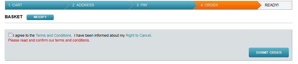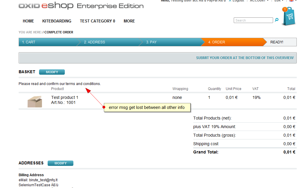 | Description | tested in 4.5.0_35089 the TAC (AGB) checkbox on the bottom of the page has to be checked to submit the order. If not done so, the shop should alert the user VERY clearly, that the submit was not successfull yet. This should be done with javascript as well as on server-side (like in step2). | ||||