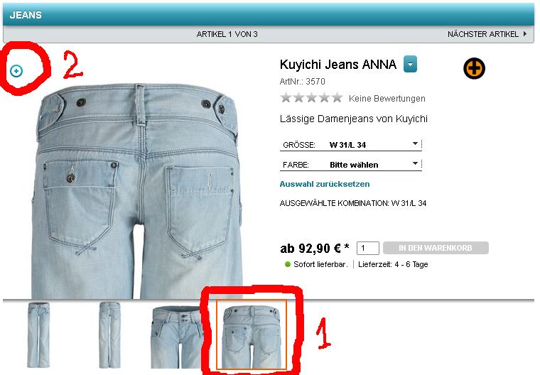 | Description | If you klick in product detail view on the zoom-button (+), always the first picture of the zoom set is displayed and NOT the current one which is displayed as product picture (chosen via icon). See screenshot: Product pic4 is chosen via icon. If you now klick on zoom, pic1 will be displayed as zoom in the pop-up and you have to klick on pic4 in the pop-up to see it zoomed. | ||||