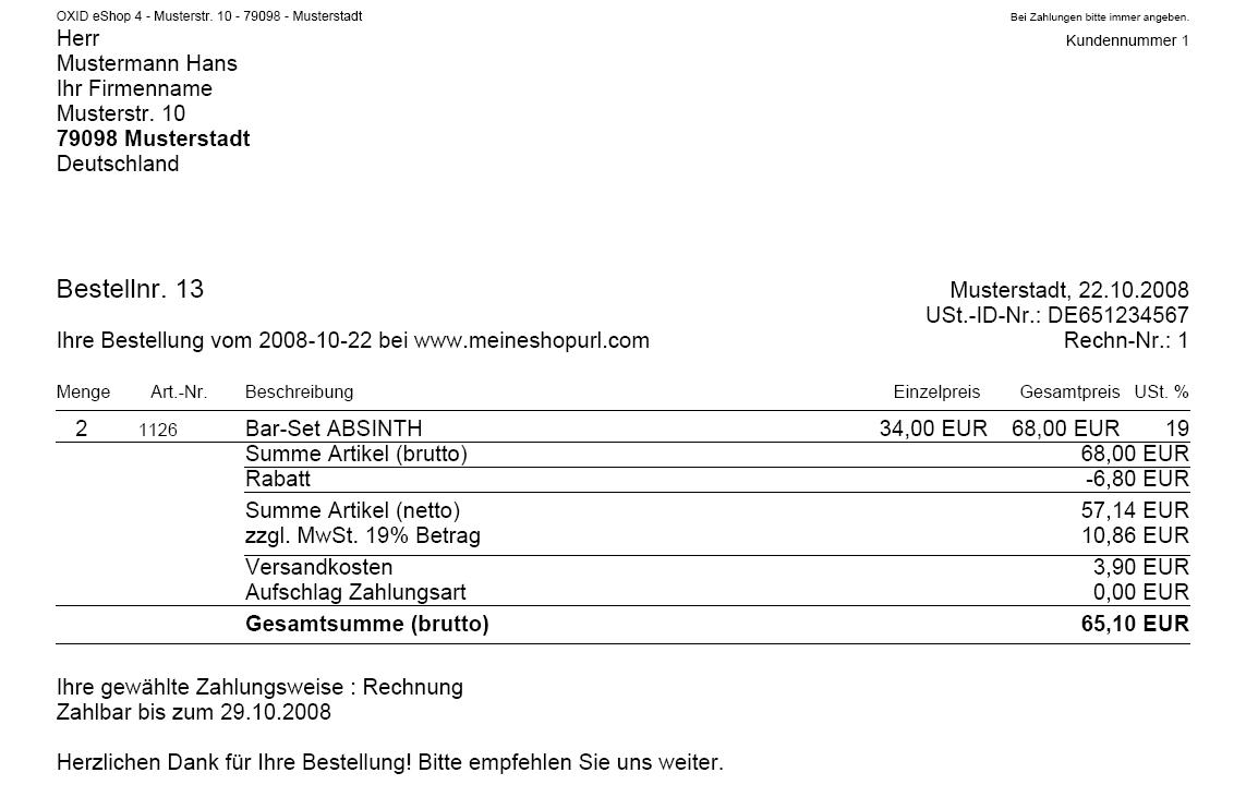 | Description | For PE version. Shop frontend: Make order with general discount or voucher discount. Admin->Administer orders->Orders: Create and open PDF. We get: Summe Artikel (brutto) 68,00 EUR Rabatt -6,80 EUR Summe Artikel (netto) 57,14 EUR zzgl. MwSt. 19% Betrag 10,86 EUR Versandkosten 3,90 EUR Aufschlag Zahlungsart 0,00 EUR Gesamtsumme (brutto) 65,10 EUR Should be: Summe Artikel (brutto) 68,00 EUR Rabatt -6,80 EUR Summe Artikel (netto) 51,43 EUR zzgl. MwSt. 19% Betrag 9,77 EUR Versandkosten 3,90 EUR Aufschlag Zahlungsart 0,00 EUR Gesamtsumme (brutto) 65,10 EUR Discount should be included in netprice and vat. | ||||