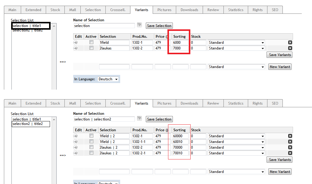 | Description | If you add variants for an article (with empty variants) by using an entry from the selection list (on the left hand) the sorting will start at 6000. Each time you add another selection the sorting values are increased tenfold so after adding 3 entries from the selection the sorting range starts at 600000. IMHO this should be optimized | ||||