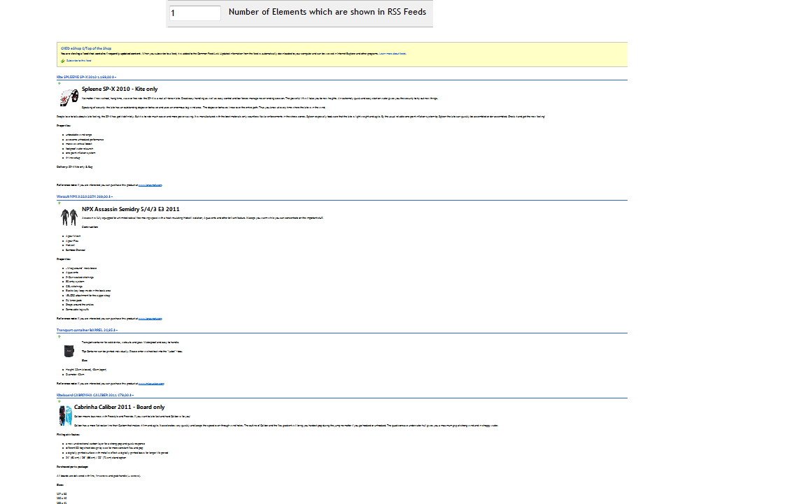 | Description | When I inserted in the eShop admin area 10 elements in Master Settings->Core settings->Settings->Other settings "Number of Elements which are shown in RSS Feeds", I see in the customers area 4 number of elements in the RSS feeds. When I inserted 2 in "Number of Elements which are shown in RSS Feeds" I still see in the customer interface 4 elements in the RSS feed. Incorrect numbers of elements shown in the RSS feeds: Top of the Shop Bargain Newest Products -Just arrived Correct numbers of elements show in the RSS feeds: Categories Search Listmania (overview) Listmania (products) | ||||
