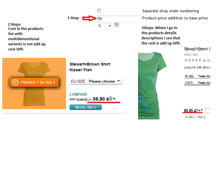 | Description | In the admin area I create a new the eShop. i set that a new eShop is the eShop parents, still I selected on the check box "Shop inherits all inheritable items (products, discounts etc) from it's parent shop". Save a new the eShop. Then i set 50% "Product price addition to base price", I go to the "Administer Products"->Categories, and I create a new categories and in the categories I assign products 2 types, 1)without multidimensional variants 2)with multidimensional variants so products who have multidimensional variants in the products list does not calculates "50% "Product price addition to base price" when i go to the details products descriptions i see that cost is up 50%. | ||||