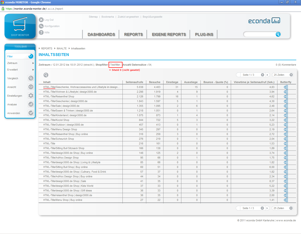 | Description | We have lots of visotors with SiteId '0' in econda. (The siteId in econda corresponds to the Oxid Shop ID of the particular subshop) According to econda support, '0' is set if no siteId is given in the js-snippet. Econda support set up a filter for us in econda so we can see what kind of contents are called in those cases. The report "Content Pages" ("Inhaltsseiten") shows that category pages of all subshops are called with missing shopId param (s. Screen attached). Notice that all of these content's titles start with "HTML-Title", which is never the case when a valid siteId is transmitted. Any ideas why this occurs? | ||||