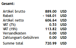 | Steps To Reproduce | 1. in admin - set the price for 0001402 to 10 EUR and its VAT to 7% - go to discounts, "enable 10% on 200 Euro or more" - in "Current Bargain", assign item 0001208 only 2. in front end - buy both product items - calculation is ok 3. in admin - go to order administration. calculation still fits with this data: Artikel brutto 889.00 USD Rabatt - 168.01 USD Artikel netto 606.72 USD VAT (7%) 0.59 USD VAT (19%) 113.68 USD Versandkosten 0.00 USD Zahlungsart-Gebühren 0.00 USD Summe total 720.99 USD - switch the tab, enter the current date for "payed on" and click the save button. Viola: the values for VAT (7%) and VAT (19%) changed for some reason. See the screenshot attached. | ||||