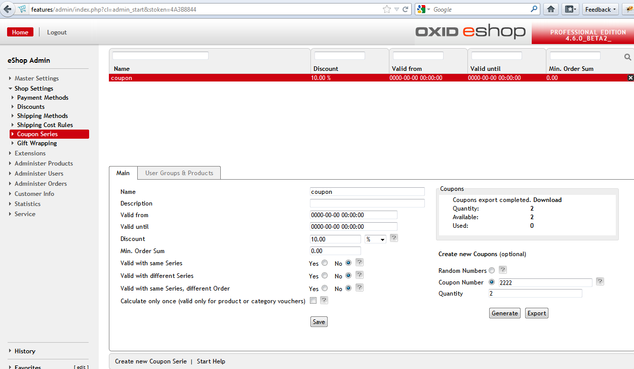 | Description | On 4.6 PE version is problem with generated coupon numbers. Steps to reproduce: 1.Create a voucher with 10% discount (Shop Settings->Coupon Series->)fill in fields ("Name"=Coupon and "Discount" =10% ) click "Save"); 2.Then fill in fields "Coupon Number"=111; and "Quantity" = 2; 3.Click on the button "Generate", and then click on the button "Export" 4.When coupons export is completed, please open the file with coupon numbers. Everything is correctly I see 2 coupon numbers. 5. Now you have delete coupons, click on the label X(Delete Entry), 6.Coupon is disappeared. 7.Again I create new a voucher, "Coupon Number"=222; and "Quantity" = 2; And when I open coupon file I see 4 coupon numbers, 2 coupon numbers is old and 2 coupon numbers is a new. but I have a 4 coupon numbers, not 2. For more details information please to see in the pictures. | ||||