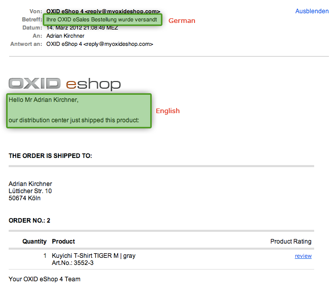 | Steps To Reproduce | #1 is easy to reproduce - finish an order with english selected in the frontend - authenticate to the admin backend in german - select the order and trigger the shipping mail = subject of this mail will be in german instead of english #2 - add a language ident in a custom language file in out/admin/en/ (cust_lang.php will work too for this to reproduce) - place this new ident in your shipping mail html template - finish an order with english selected in the frontend - empty the tmp directory - authenticate to the admin backend in german - select the order and trigger the shipping mail = the custom language ident won't be translated and you will see the ident name instead. The only way to get this working is to make sure the english admin language file cache is built (by logging into the backend with english selected) or to add the new ident to the lang.php. Both solutions aren't acceptable. | ||||