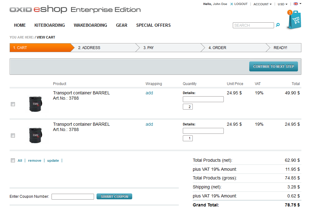 | Steps To Reproduce | Add one "Transportcontainer THE BARREL" to the basket. Go to basket, click on "Update". Then go back to Main page and add the same product to the basket once again. Go to basket - you will see two entries of the same product, with quantity 1 (that's wrong). If you would click "Update" - then products would be merged to one entry with quantity 2 (should work like this since beginning). | ||||
