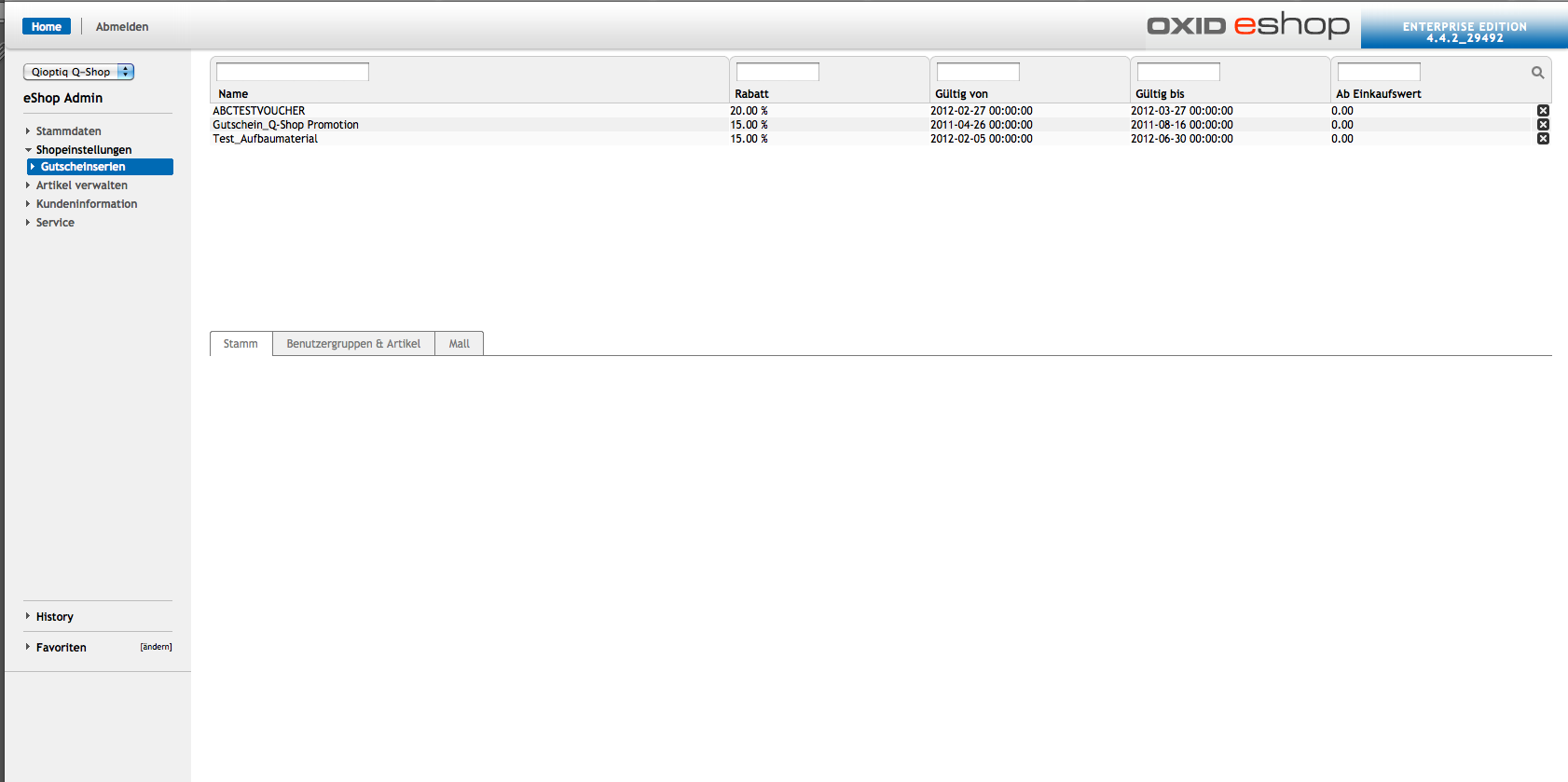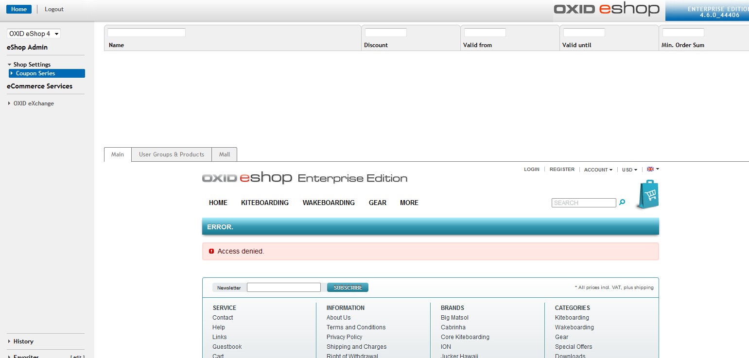 | Description | The main shop-admin can edit all voucherseries normally. Another admin-user is member of the role "Vouchers (Gutscheine)". This role has been given full access to the "Shop Settings > Coupon series". However, when this user logs in and goes to "Shop Settings > Coupon series", he only sees the voucher list in the upper half of the window, while the lower pane remains empty: only the Tab-Headlines Main, User-Groups, Mall are visible but nothing else (see screenshot). When the user clicks on any item in the voucher list, nothing happens, i.e. no voucherseries is loaded or shown in the details pane. It seems like the JavaScript function loadEditFrame(sUrl) is not called in this case. Since it works for the main admin, the template should be alright. It may be caused by the roles/rights settings. | ||||
