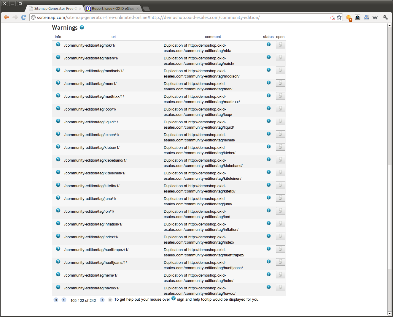 | Description | Using a crawler , I found out that this crawler apparently was able go generate a URL that already existed before for the same page by adding the number "1" to it: e.g.: /tag/glue/1/ /en/tag/glasses/1/ /tag/index/1/ /tag/huefttrapez/1/ (please see the screenshot attached for more details) Please note: - only tags are affected - this pages seem to be generated with crawler only (couldn't reproduce it manually, you can only access these URLs when the crawler has generated it before) - means: a search engine crawler would do the same and produce DC with it! On some place, there seem to be a link that puts the wrong URL together. | ||||