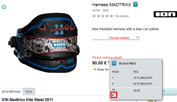 | Description | 1. Scale prices are switched on in admin. Go to Administer product->Product-> Stock tab and define price ranges. Discount for scale price should be set in "abs". 2. Go to frontend, select that product and go to product detail page. 3. Open scale price(block price in frontend). Currency sign is displaying in new line. Should be displayed in the same line next to the price. | ||||
