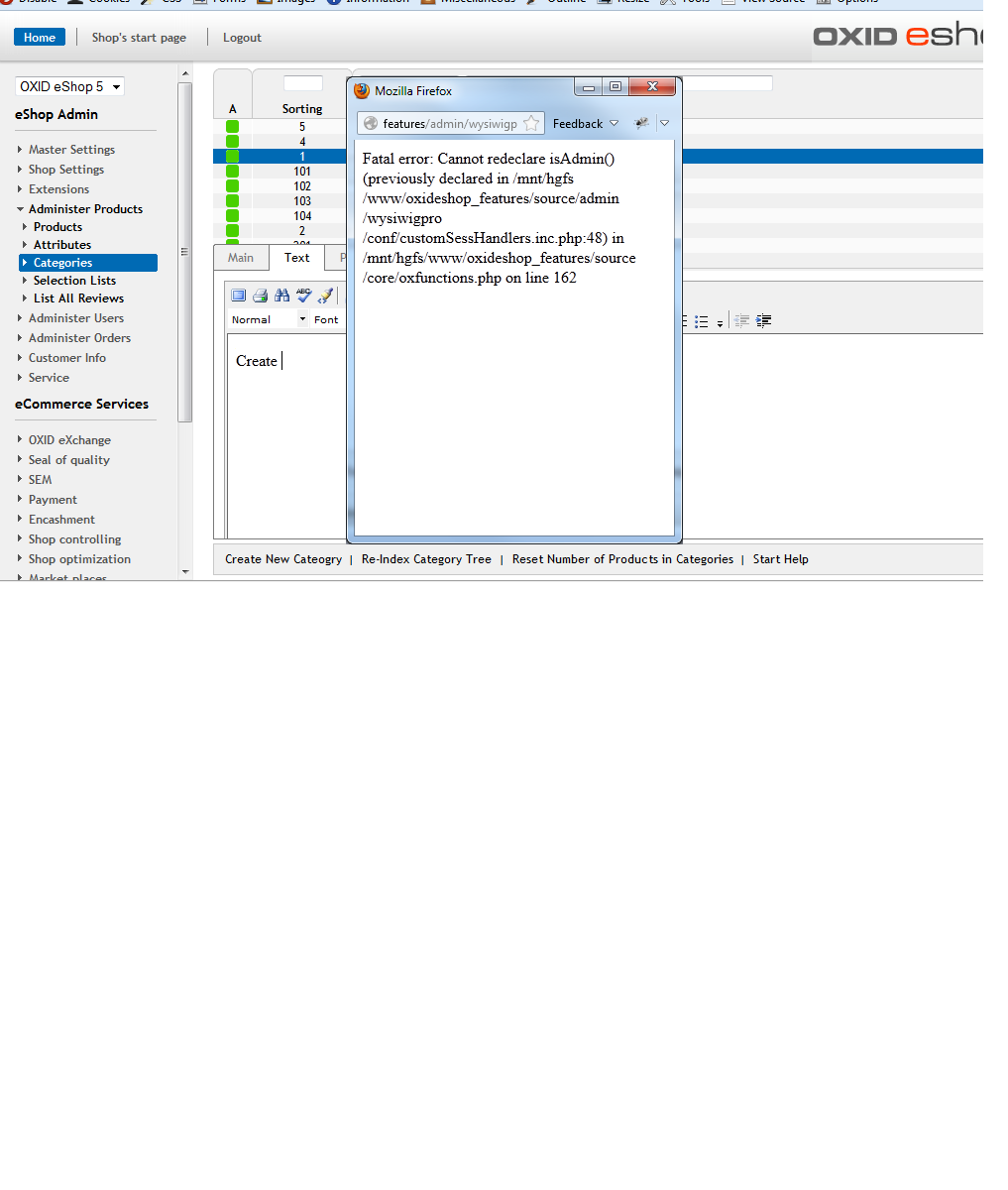 | Description | Fatal error: Cannot redeclare isAdmin() (previously declared in /var/www/testshops/ee5beta/admin/wysiwigpro/conf/customSessHandlers.inc.php:48) in /var/www/testshops/ee5beta/core/oxfunctions.php on line 0 in http://testshops/ee5beta/admin/wysiwigpro/dialog.php?dialog=wproCore_colorPicker&wprosid=988ea37b60d1711bfd3ddd9a27d8a9c4&sid=r0tnpt1545n9sjnu26jtjpddi4&dWidth=324&dHeight=400 | ||||