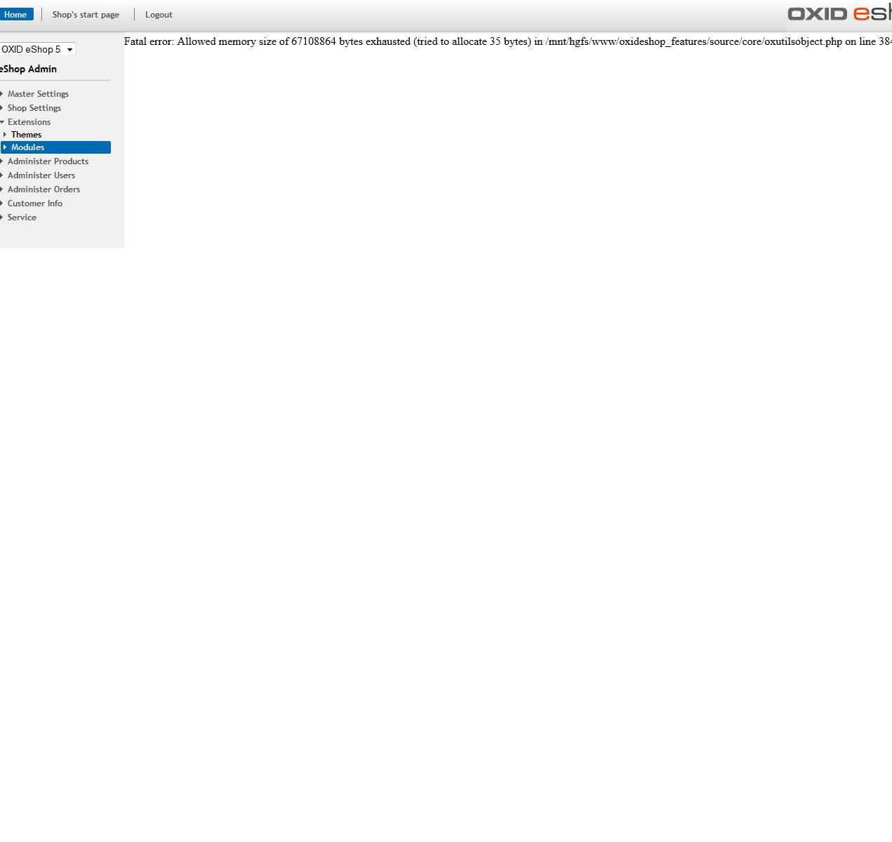 | Description | shop doesn't working when module (Extended classes: oxconfig->myconfig ) without directory is activated in admin and later the same module is moved to the new directory. 1. Open admin. 2. Active module for example "myconfig.php". 3. Go to shop (Source -> Modules) and then need to create new directory "Modul" 4. then module "myconfig.php" need to move to the new directory. 4. Go to admin "Extensions->Modules" and see is displayed: Fatal error: Allowed memory size of 67108864 bytes exhausted (tried to allocate 35 bytes) in /mnt/hgfs/www/oxideshop_features/source/core/oxutilsobject.php on line 384 | ||||