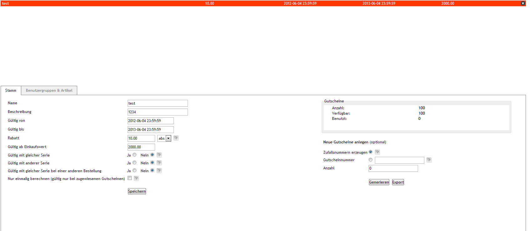 | Steps To Reproduce | 1. create two articles (article A = 100€ and article B = 1.000€). 2. create a coupon. 3. set minimum costs to 1.000€. 4. assign the coupon only to article A which costs 100€. 5. add article A to the basket and try to activate the coupon (it will fail). 6. add article B, so the total sum is now 1.100€. 7. try to activate the coupon - it will work Please see attached screenshots 1 - 4.png | ||||