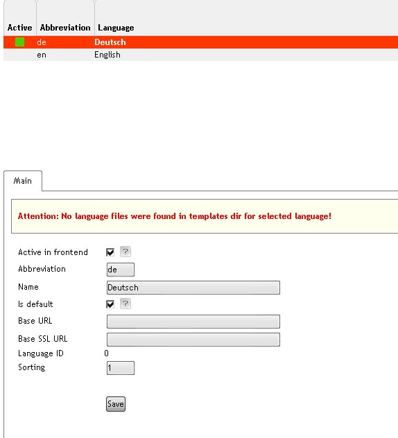 | Description | Admin --> [Master Settings] --> [Languages]: if one languages is selected this message appears: "Attention: No language files were found in templates dir for selected language!" | ||||
