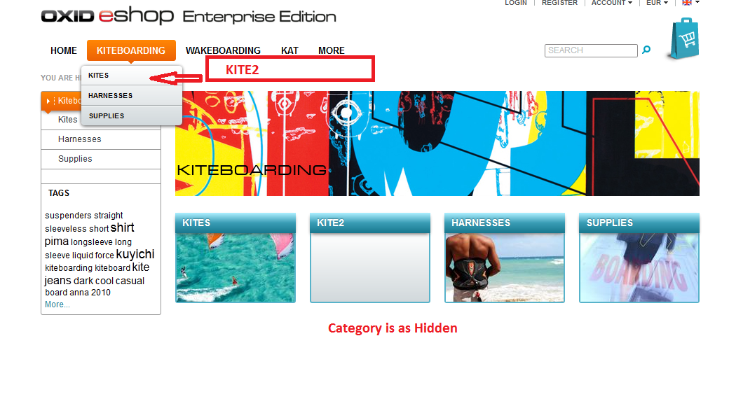 | Steps To Reproduce | 1. Open admin -> Customer info -> CMS pages ->create CMS page as category „Kite2“ 2. then insert CMS page „Kite2“ before „Kiteboards“ category 3. Go to Administer Products ->Categories choose category „Kiteboards“ and turn on checkbox „Hidden“ 4. Go to shop click on category KITEBOARDING 5. And then CMS page is not displayed in the category –tree, cms page is displayed only in subcategory list. For more details please to see in screenshot . | ||||