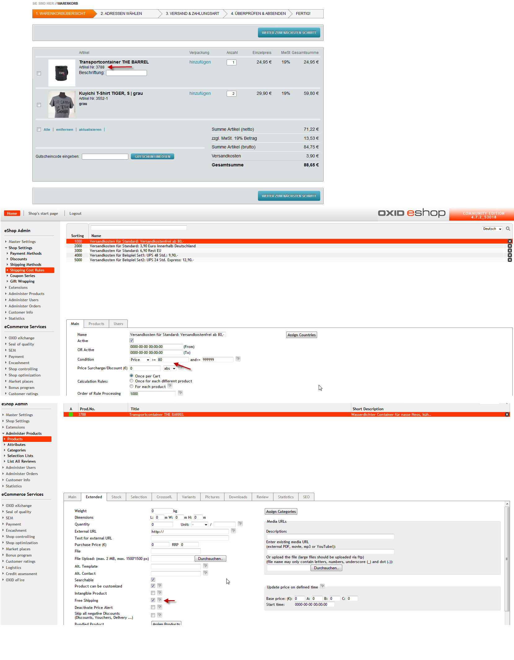 | Description | Please have a look in attached image. In my opinion are the shipping cost rule for free shipping calculated on wrong basis. If one product is selected for free shipping (product administration), the product price is not considered for calculation for free shipping. In attached example the marked product is set for free shipping. if in the basket is only that product no delivery costs are calculated => correct. But in attached example I have added a second product so that the total amount is bigger than 80€, where the shipping costs should not be charged. But in that case the shipping costs are charged, which is wrong. In that admin settings "intangible product" is not selected. Because the other way I checked: if we would say that above mentioned situation is correct, that product with free shipping should not be considered in calculation, than I would try to set a product as intangible product (where normally no shipping costs are charged) and deactivate it for "Free shipping". But that is not working as well. Then shipping costs are charged although only the intangible product is in the basket. Hopefully you understand my explanations... :) Otherwise feel free to ask me. | ||||