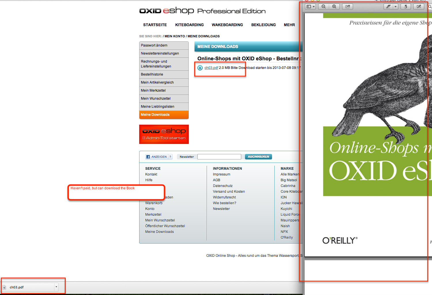 1. Put the Oxid-Book in your basket http://demoshop.oxid-esales.com/professional-edition/Downloads/ 2. Order it with pay in advance (Vorauskasse) 3. Go to your account and download it -> you can download it, although the order isn't flagged as paid (see screenshots). |