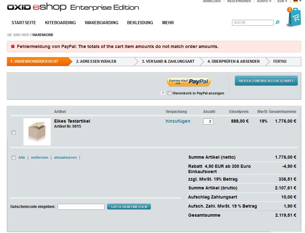 | Steps To Reproduce | Shop configuration in OXID eShop Enterprise Edition, Version 5.0.6 and PayPal Module 2.1.0 installed: VAT Settings (see Screenshot) Discount Settings (see Screenshot) PayPal Error (See Screenshot) | ||||