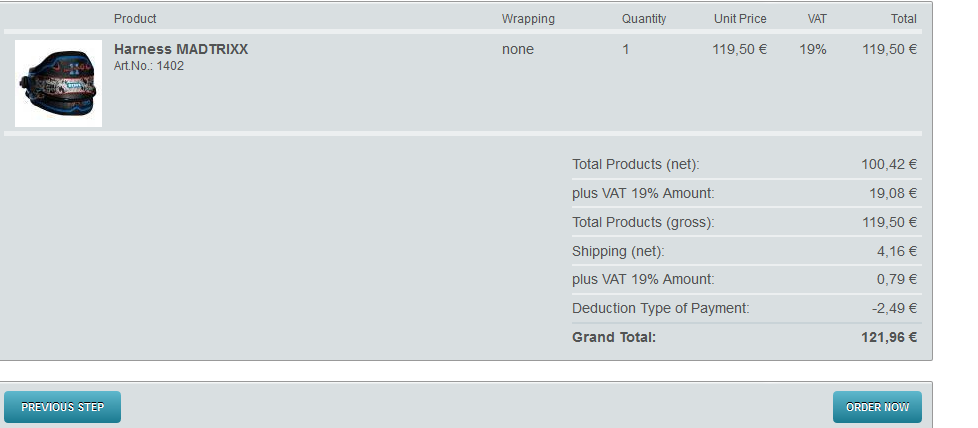 | Steps To Reproduce | Order an article with tax an shipping fee. Pick a payment with discount or fee and you see the shop calculating like in this example: Artikel netto 100,42 EUR Artikel brutto 119,50 EUR Rabatt - 0,00 EUR MwSt (19%) 19,08 EUR Versandkosten 4,95 EUR Zahlungsart-Gebühren -2,49 EUR Gesamt Netto 120,09 EUR Gesamt Brutto 121,96 EUR Now let's check this results: 121,96 / 119 * 100 = 102,49 != 120,09 | ||||