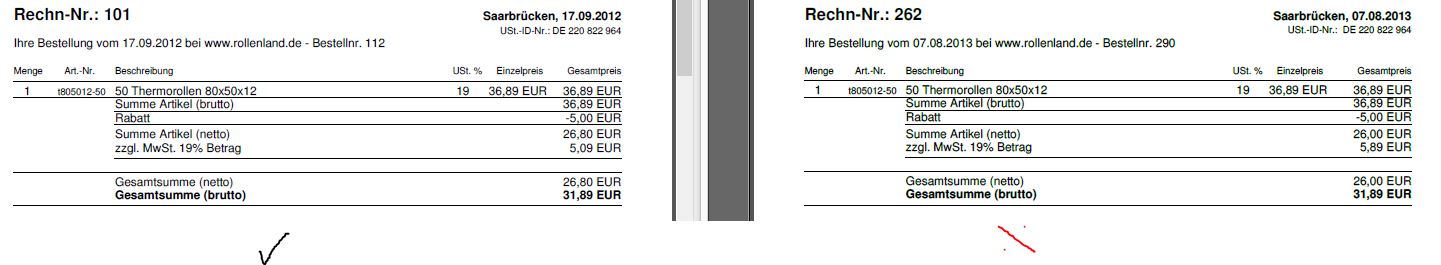 | Description | We installed a complete new Oxid-shop systemystem, version 4.7.0.5.0.0 revision 51243, on our server (hosted) and since our relaunch we find a reproducible error, concerning the calculation of VAT, when a sales discount is manually granted in the back office of the shop. As you can see in our attachment(on the left is the right calcualtion, right is wrong), the discount is subtracted from the gross amount correctly, but the VAT, in this case 19 %, from the new, reduced gross amount is calculated wrongly. This error didn’t occur in our old Oxid shop system, version 4.6.4_42471. Please control and verify our error message and inform us, when this error will be corrected. Thank you very much. Yours sincerely | ||||