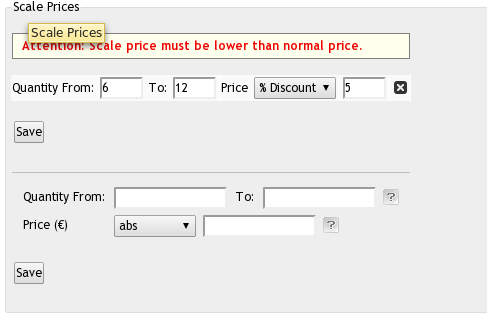 | Summary | 0005333: Scale prices: "Attention: Scale price must be lower than normal price" appears also for percentage | ||||