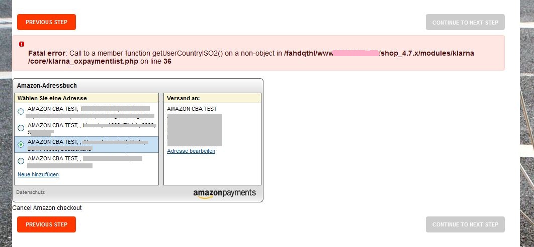 | Description | The Amazon Payments plugin is not compatible with the Klarna plugin. Apparently both plugins use a same method with the name "getUserCountryISO2()" (see file attached). After one choose an address and payment method in the Amazon Widget the message shows up and the continue to next step button is shown greyed.