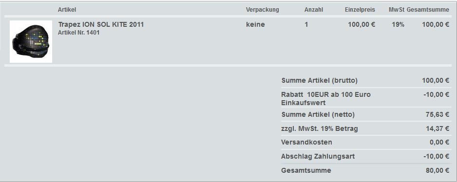 | Description | see screenshot attached. Correct calculation is: Sum articles 100 EUR Discount -10 EUR Price Surcharge -10 EUR VAT 12,77 EUR in Shop we calculate 14,37 EUR (19% from 90 EUR) SUM 80,00 EUR | ||||