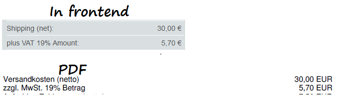 suggestions by the names: "blShowVATForDelivery" -> show it ADDITIONALLY "SHOP_CONFIG_CALCULATEVATFORDELIVERY" -> calculate it ADDITIONALLY It seems that the "instead"-logic came after creating that names, it has changed (in version CE 4.4.x the brutto-price were still displayed). In administration it states that "instead"-logic within the label-translations ... but im stuck in the situation i want to display BOTH. thats why i dont know if its a clear bug or clear feature-request (because it behaviour changed). |