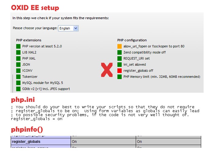 Looks like title for this requirement is confusing. According to OXID eShop system requirements - register_blogals should be OFF.