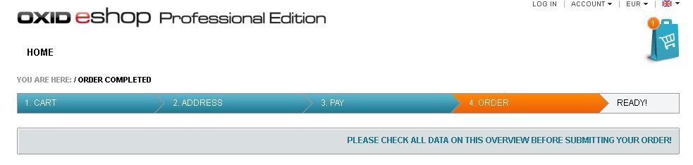 | Description | Oxid Demo Shop Checkout: step 4: Order You are here: / Order completed step 5: thank you You are here: / Order completed Both breadcrumps take language var: 'ORDER_COMPLETED' => 'Order completed' Expected for step 4: use language var 'COMPLETE_ORDER' => 'Complete order' | ||||
