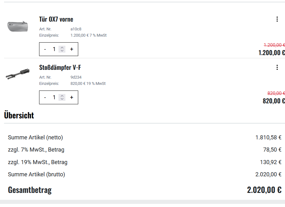 | parent of | 0005795 | resolved | anton.fedurtsya | Percentual voucher assigned to article leads to wrong VAT and netto sum calculation in mixed baskets |