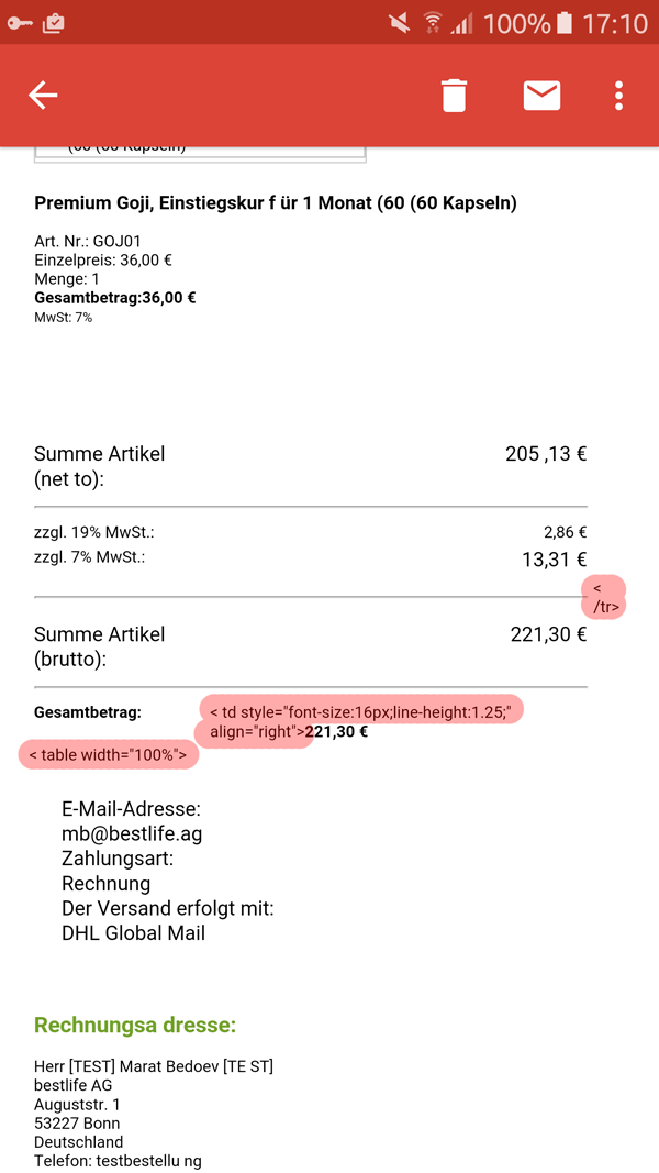 | Steps To Reproduce | 1) find someone with an exchange server 2) create an account with email address hosted on this exchange server 3) place order 4) if it "works", you will see random visible html tags in your email and broken layout | ||||