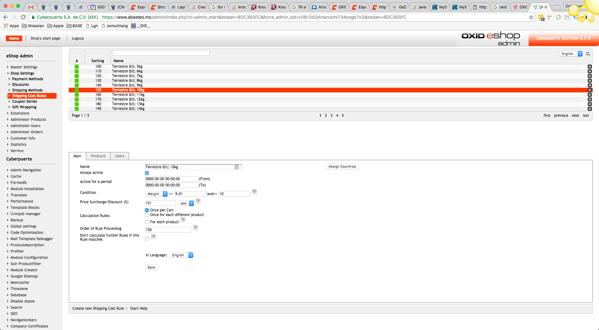 | Additional Information | I add a link to a video http://screencast.com/t/KZyNYzMuOy The combination of my products add different weights, first it adds 8.9 and then 10, as you can see 8.9 list all the payment and shipping methods available but 10 does not displays anything and it sets the delivery price to free. | ||||