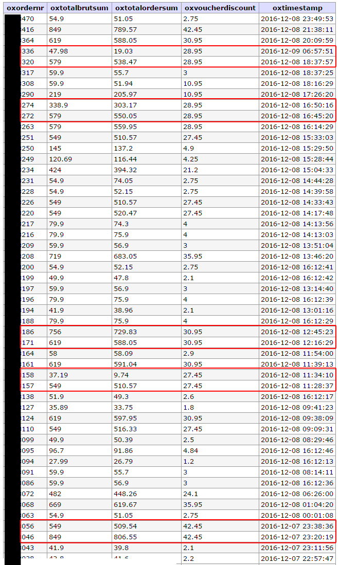 I uploaded a screenshots of the orders with the assigned voucher. The voucher was set to 5% for an assigned group of articles only. The voucher code is the same for the voucherseries. (no unique vouchercodes - this is important) The red highlited parts are orders with the same voucherdiscount amount, but with wrong calculation for the newer one. - so it seems that the amount is taken by the older order/session ?? We stopped this promotion, because it caused too much trouble, so iam nnot able to produce the error in live situtation. we will try to reproduce this bug in dev and give feedback. |