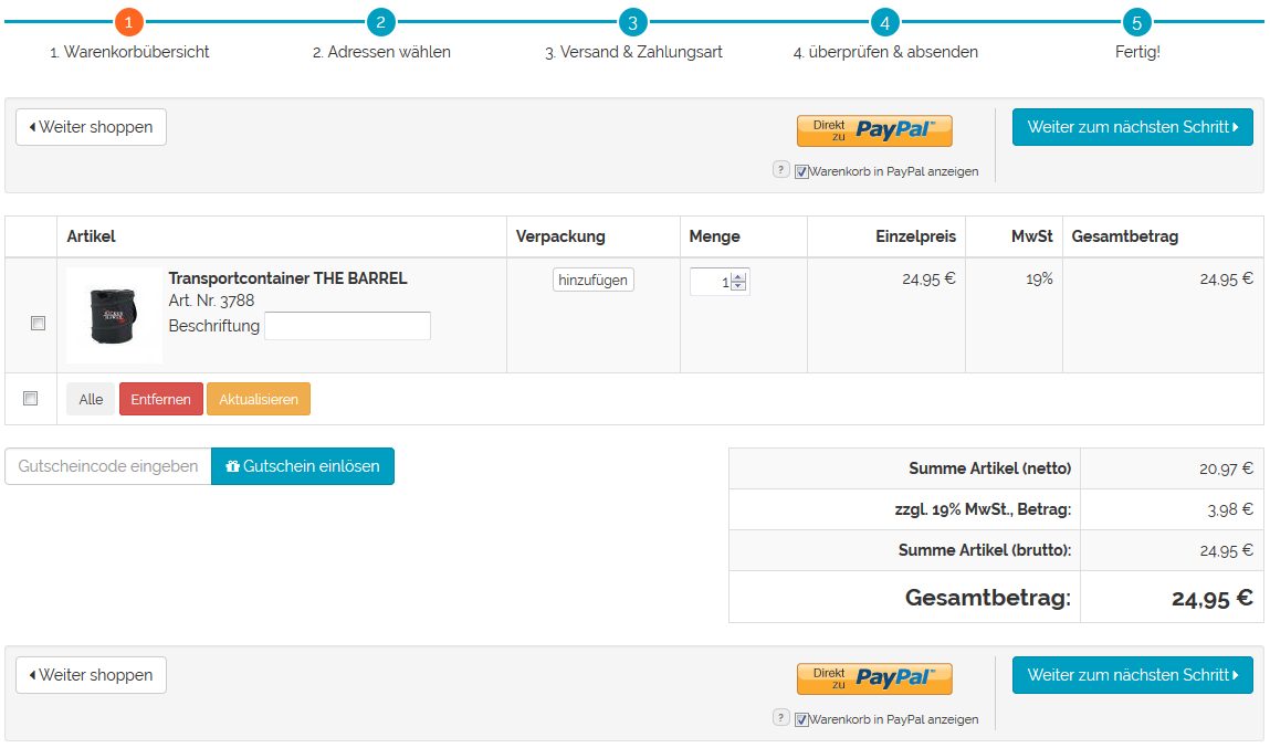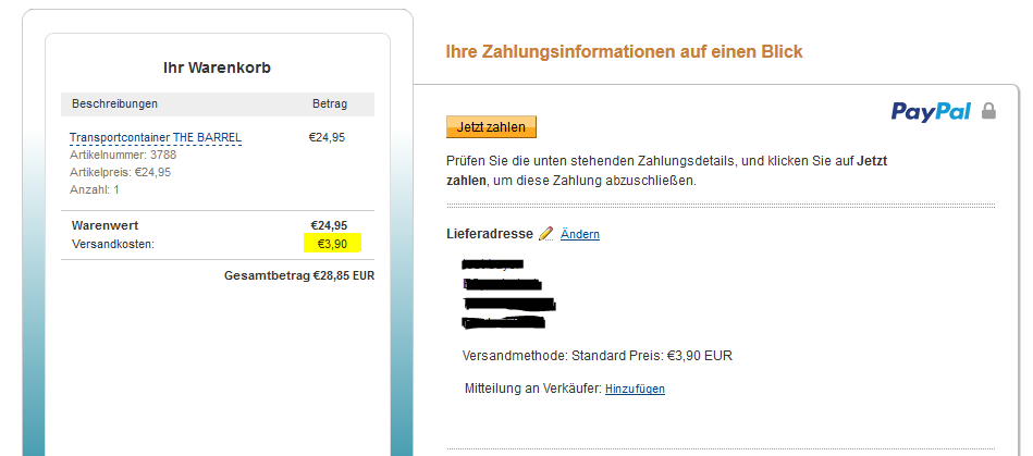 | Steps To Reproduce | PRECONDITIONS - OXID eShop Professional Edition running (e. g. OXID's demo shop) - PayPal module active and configured - Shipping costs configured - Shipping costs applied to orders below 80,00 EUR - Ordering as a guest is enabled in the shop settings - E-mail address available which has never been used before in the shop STEPS TO REPRODUCE 1. Go to https://demoshop.oxid-esales.com/professional-edition/ 2. Add an item below 80,00 EUR to the cart (e. g. "Transportcontainer THE BARREL"/ArtNr: 3788) 3. Go to the checkout, checkout as guest (shipping cost should be 3,90 EUR, see "Cart.PNG") 4. Use PayPal Express for payment (shipping cost is still shown as 3,90 EUR, see "Paypal payment.PNG") 5. Finalize payment steps on PayPal side and come back to the shop ACTUAL BEHAVIOR The following error is thrown: »Auf Grund Ihrer Auswahl im PayPal Express Checkout hat sich die Bestellsumme geändert. Bitte prüfen Sie Ihren Warenkorb und fahren Sie fort. Hinweis: Um den Express Checkout fortzusetzen, drücken Sie den Express Checkout Button erneut.« The Shipping cost is reset to 0,00 EUR instead of 3,90 EUR. See "Error.PNG" for more details. EXPECTED BEHAVIOR No error message shown, shipping cost does not change but is still 3,90 EUR after customer returns from the PayPal page to the checkout. | ||||