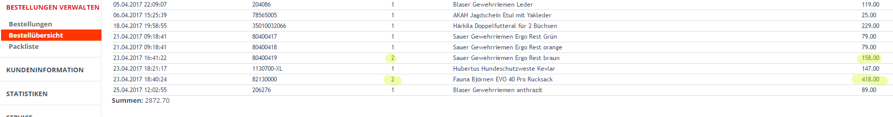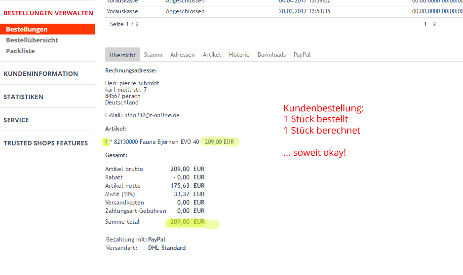 Ok, i try to explain. In the screenshot "orders_list", you can see the order from 23.04.2017 18:40. It looks, that the customers orders 2 x "Fauna...". But if you click in the orders_details (see screenshot "orders_details") you see, that the customer orders only 1 x "Fauna ...". (The same happens with the order 23.04.2017 16:41). I´ve looked to the table "oxorderarticles". I found two rows with the "Fauna..." article. One from the order descriped before, and one from another correct order. You can reproduce it, by ordering the same article with two different accounts, so that you´ve two orders in the backend. Then have a look at the list order. You see one of the orders, with 2 items of the same article. Here my temporary solution: When you have a look to the method: List_Order->_prepareWhereQuery You see, that you group the listing-SQL-Result by oxorderarticles.oxartnum $sQ .= " group by oxorderarticles.oxartnum"; I´ve fixed it, by overloading the method with my own grouping: $sQ .= " group by oxorder.oxid, oxorderarticles.oxartnum"; So i have the correct order, with the correct count of articles by order. |
