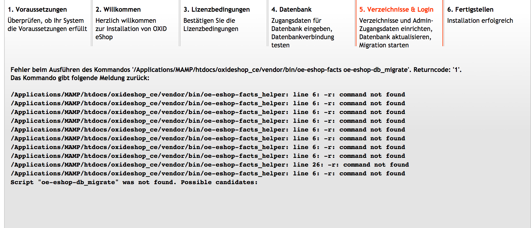 The error from the screenshot shows that the real problem is the fact that the PHP executable path is not found. Kindly execute the following command inside the shop directory where source/ and vendor/ directories are present and send us the output: VERBOSE=1 vendor/bin/oe-eshop-facts oe-eshop-db_migrate |