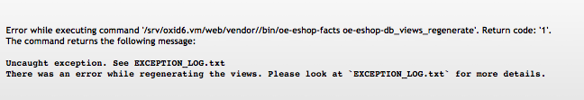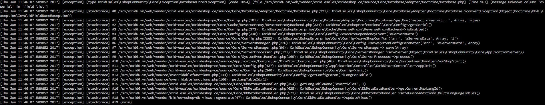 You can see from the exception message that the field "oxserial" does not yet exist in the "oxshops" table and therefore the setup can not be completed successfully. Because the Community Edition is the base, the field is not in the database. So the migration of CE -> PE -> EE has not yet been executed yet. This suggests that the bash scripts are not running properly. The statement to execute the migration scripts is in the file composer.json: "Scripts": { [...] "Oe: migration: run": "oe-eshop-facts oe-eshop-db_migrate" "Oe: migration: new": "oe-eshop-facts oe-eshop-db_generate_migration" "Oe: views: regenerate": "oe-eshop-facts oe-eshop-db_views_regenerate" } The files containing the SQL changes are located at the following location: vendor / oxide esales / oxides shop-pe / migration / data / Version20160919103142_ce_to_pe.php vendor / oxide esales / oxides shop-ee / migration / data / Version20160919103142_pe_to_ee.php Since the queries execute the SQL command "Alter table", the database user should be checked for sufficient rights. This might have been rejected by the database when you changed the table. Corresponding notes should be found in the activated MySQL log. |