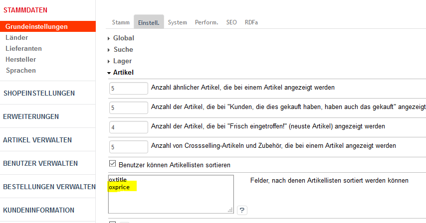 If in the shopadmin oxvarminprice is registered instead of oxprice, then is sorted according to the minimal variant price of the article. This also works. See in demoshop http://demoshop.oxid-esales.com/professional-edition/Bekleidung/Fashion/Fuer-Sie/Jeans/ Bekleidung -> Fashion -> Für Sie -> Jeans |